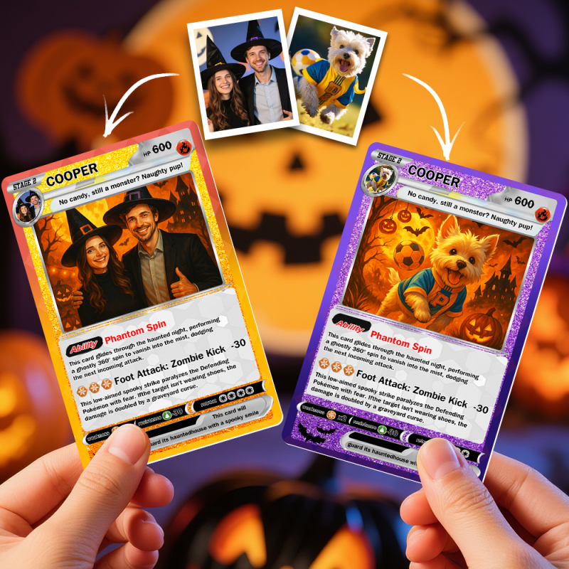 Feiern Sie die Magie der Feiertage mit einer individuellen Pärchen-Sammelkarte, die nur für Sie gemacht ist! Ob gruselige Halloweennacht oder gemütliche Weihnachtsfeier – verwandeln Sie Ihr Lieblingsfoto in eine lustige Karte im Cartoon-Stil mit Ihren Namen und einem festlichen Motiv.