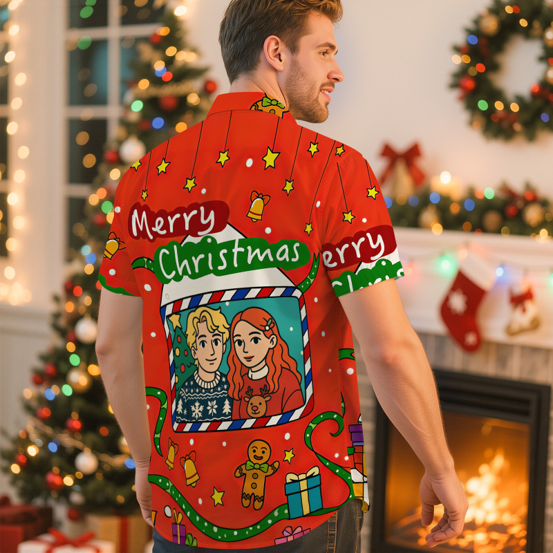Startseite / Personalisiertes Cartoon-weihnachtshemd Mit Knöpfen, Individuelles Foto-weihnachts-pärchenhemd