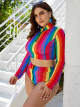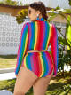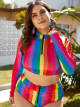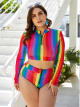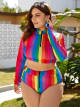 Startseite / Regenbogen gestreift Plus Größe Split Badeanzug hohe Taille sexy Reißverschluss lange Ärmel zwei Stück